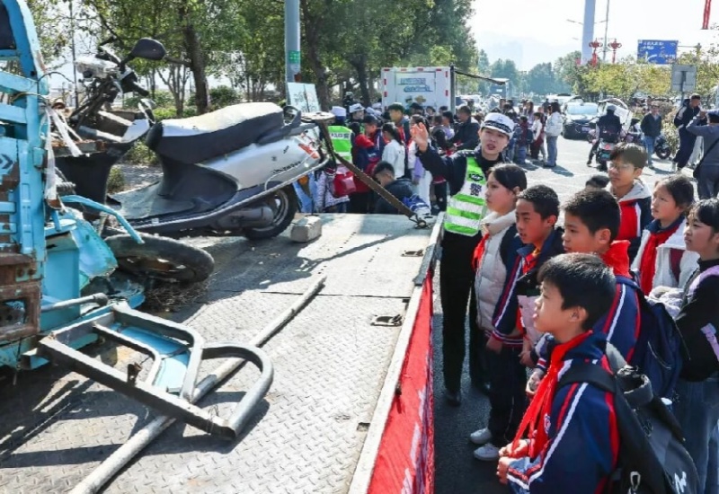 民警以现场二、三轮事故残骸车为例,介绍事故发生经过、剖析成因。家长们拉着孩子的手,面色凝重地讲解:“你看,开车不遵守规矩,就会变成这样。”这种“零距离”接触带来的视觉与心理冲击,远比书本说教更深刻,让“安全第一”的理念从抽象变得具象。
