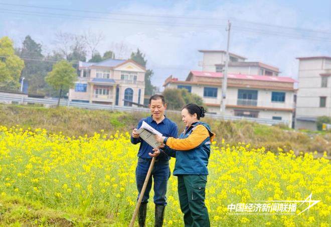 图为邮政工作人员在油菜花田间为农户讲解农技知识