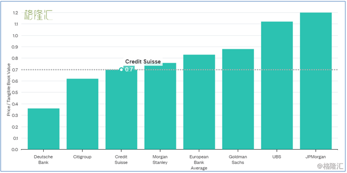 从市值与有形的账面净资产比值来看,德银在主要全球大银行中垫底,且是矮了一个等级的垫底,比倒数第二的花旗低了近50%。