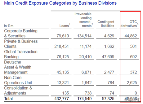 另外,德银的资产负债表只公布了它的衍生品信用风险敞口,即交易对手风险,其场外衍生品的信用风险敞口为490亿欧元。但是这些衍生品的价值随着市场条件波动可能发生的风险是不透明的,外界无法得知。