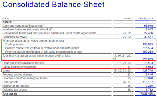 而另一方面,比起德银规模庞大的投行业务,其传统的零售银行相对比较小。根据2015年年报资产,德银金融衍生品资产达到了5150亿欧元,占总资产的32%,如果算上其他以公允价值及具备交易性的资产3053亿欧元,两者合起来占比达到50.4%。其贷款规模为4277亿欧元,占总资产仅26%。这意味着德银没有大规模的相对安全的零售业务来平衡其风险高,规模大的投行业务,导致其资产对市场的变化非常敏感。