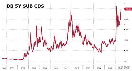当极端情况发生时,也即风险模型可能失效时,市场有理由去怀疑德银并未准备好。这就是英国公投脱欧发生后,德银CDS价格狂飙的原因,5年期债券CDS产品再度攀升接近500基点,这是2月以来的最高值。就像米什金曾经指出的,2008年随着雷曼的倒闭,市场有理由相信AIG卖出的大量衍生产品将会被迫追加保证金,这会导致其现金枯竭。
