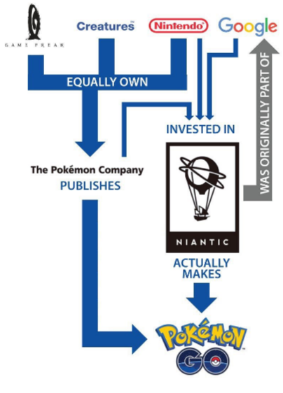 Pokemon Company是口袋妖怪这款游戏的发行公司,而任天堂同时持有Pokemon Company 32%的股权,其余股权由Game Freak和Creatures Inc.共同持有。谷歌旗下的Niantic是口袋妖怪游戏的制作方,任天堂、谷歌和Pokemon Company去年秋天对Niantic联合注资2000万美元(具体三家的出资比例并未公布)。