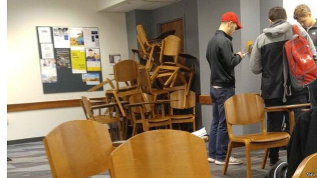 教学楼内的学生们用椅子堵住房门,以防事态扩大。来源:美国ABC新闻