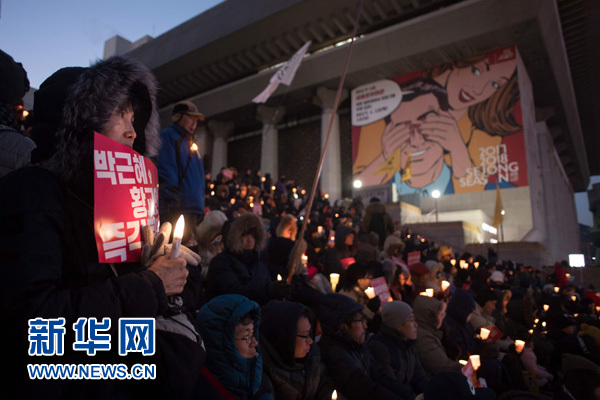 参加烛光集会的市民冒着零下10摄氏度的严寒,举着“朴槿惠下台”“尽早弹劾”“拘留政治共犯和财阀”等标语牌,要求拘捕“文化界黑名单”主犯、青瓦台前秘书室室长金淇春,逮捕涉嫌“权钱交易”的三星电子副会长李在镕。