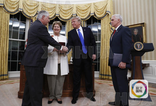 2月1日,在美国华盛顿白宫,美国总统特朗普(右二)与新任美国国务卿雷克斯·蒂勒森(左一)握手。新华社/美联