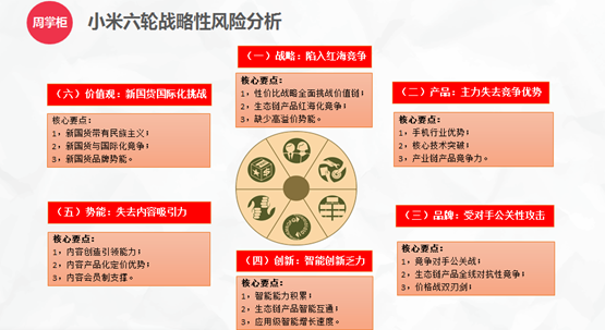 通过图4小米六个轮子战略性风险分析图,我们可以系统性的梳理小米生态的战略性风险,包括如下六个方面: