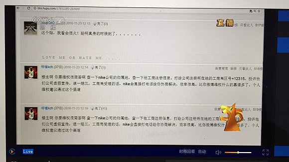 这则消息,最开始是在国内著名体育论坛“虎扑”中曝出的,而在昨晚的现场曝光中,央视也大量引用了虎扑网友的发帖与留言作为曝光的证据,然而,一位不愿透露姓名的爆料人却告诉封面新闻(thecover.cn)记者,在315的晚会曝光后,耐克竟然找到虎扑,希望虎扑“删帖”!