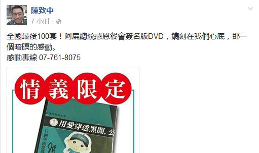 陈水扁儿子陈致中6日上午在社交媒体脸书发布“软广”,只要支持“一边一国爱台湾产品”,即赠一套陈水扁“总统”感恩餐会签名版DVD,还强调全岛只剩最后100套。