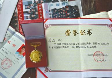 李磊出国之前,于去年年底回家时把随身带的日记和相册等物品都带了回来。昨日,这些遗物也一一摆在家门口,供亲友缅怀瞻仰,其中非常突出是他的一些荣誉证书和军功章:在2012年度预选士官专业技能比武中,他获得了装甲车底盘修理专业第二名;2014年,他在年度保障工作中成绩优异,所属装备被评为标准车,获得了荣誉奖励;当年他还在实兵对抗演习中获得了一枚“百旅之杰”的军功章……从这些表彰中看到了一名优秀士兵的成长历程。