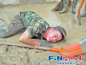 11日是李益民的生日。他5点半就起床了,将救灾工具检查了一遍又一遍。当天,他所在的部队担负的是永泰县受灾最严重地区之一的南湖小区的清淤任务。没过膝盖的淤泥下是各种垃圾和枯枝败叶。由于窨井口被杂物堵塞,导致南湖小区内污水无法排出,严重影响居民出行。