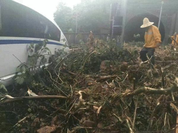 多名网友发布的照片显示,一辆和谐号动车停在铁轨上,被周边的泥泞和树木断枝阻挡无法通行,一旁站着维修人员。此外还有乘务员正相互拉拽上下车,以及拖着行李箱在浸满水的路上等候。